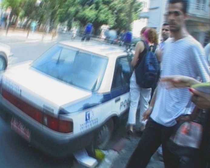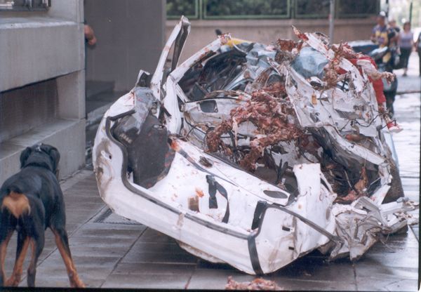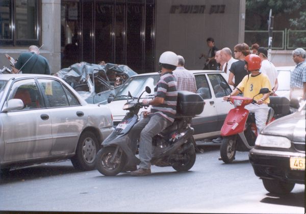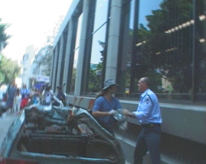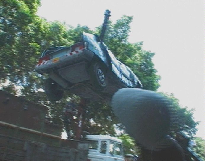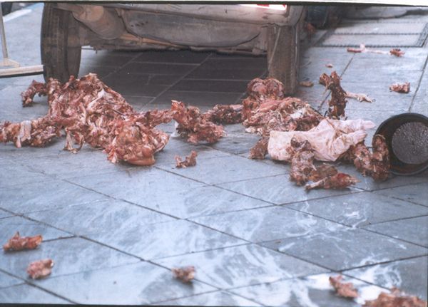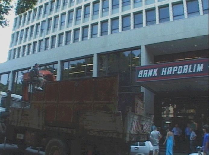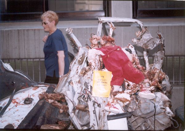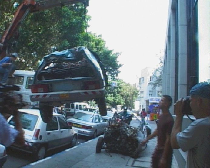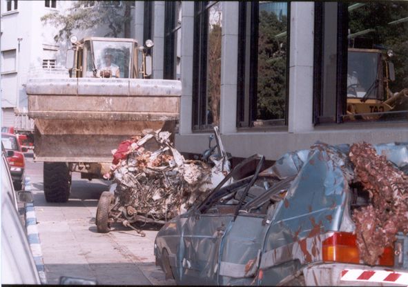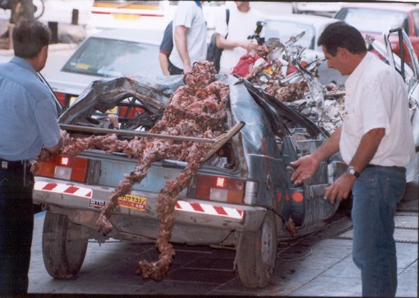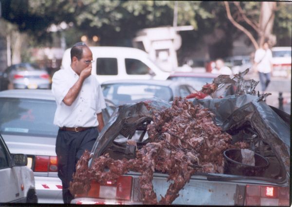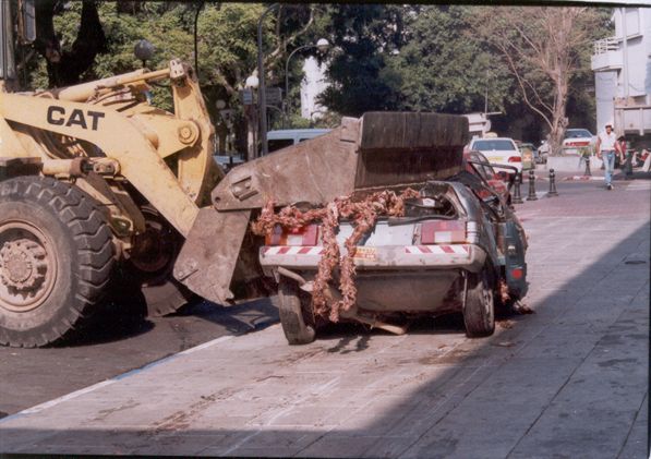 The Direct Action was infront of the central Bank Hapoalim at Rotshild, Tel-Aviv, because Hapoalim is Funding Trans-Israel Highway. Emilio have built several human corpses from poultry meat and place them in cars that had been involved in traffic accidents and organized with this appalling sight of "corpses" a protest against the construction of the controversial Trans-Israel Highway, which will cause irreversible desecration of nature and will bring about further pollution, and more deaths. |